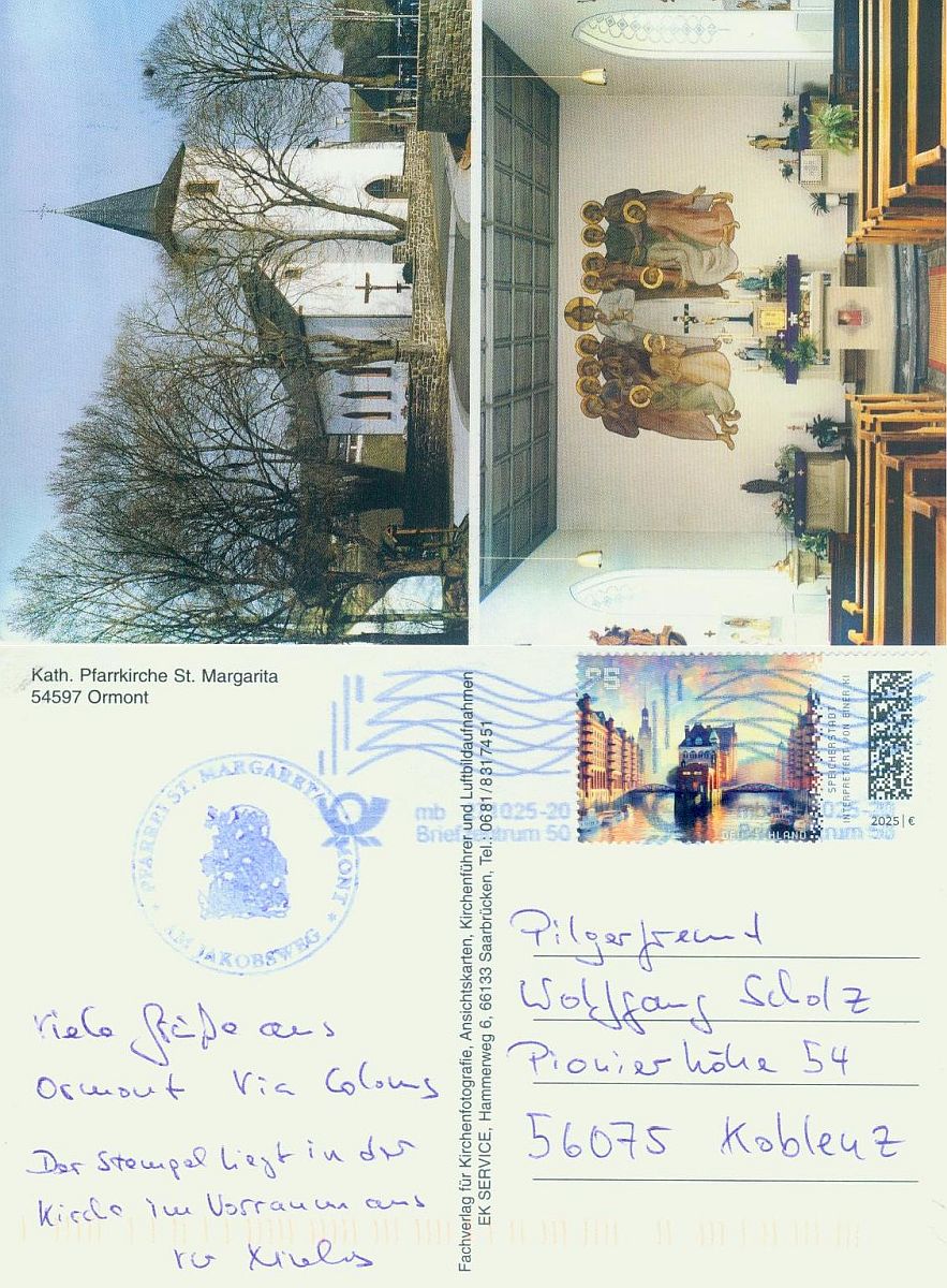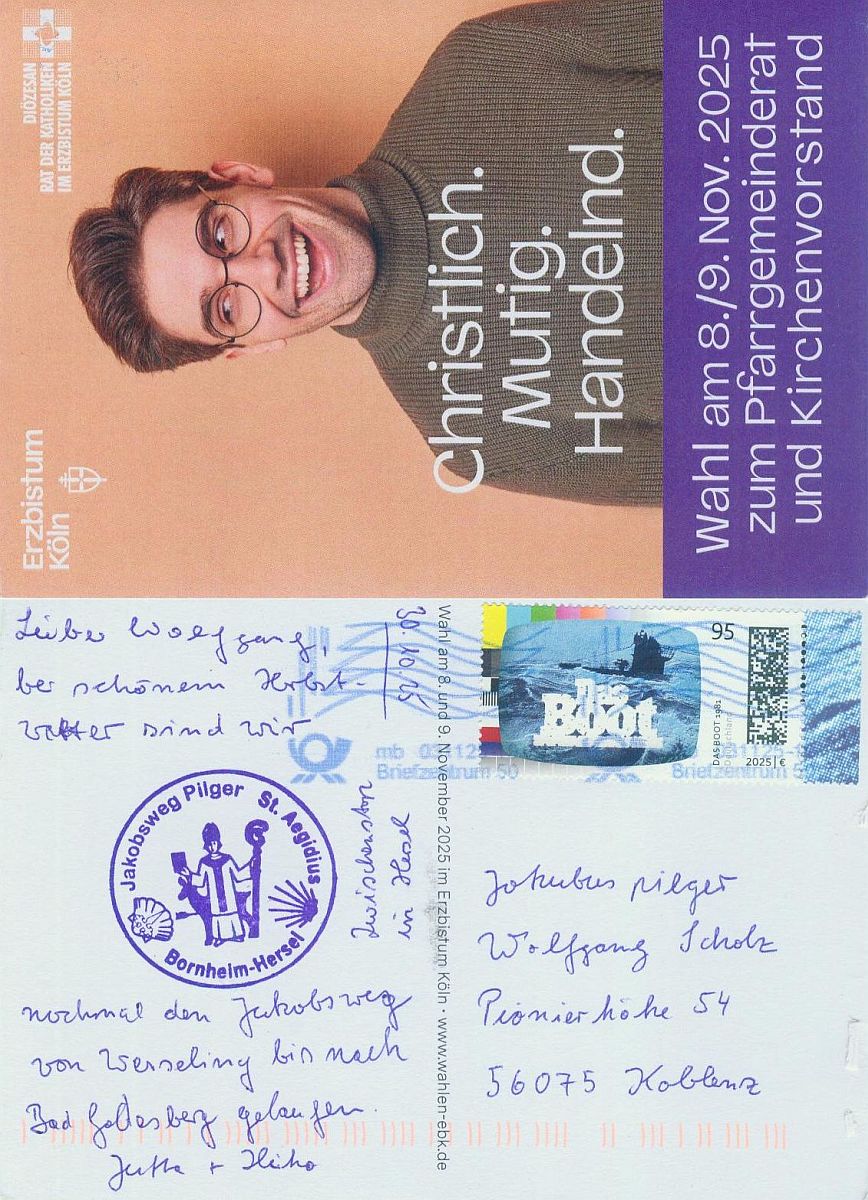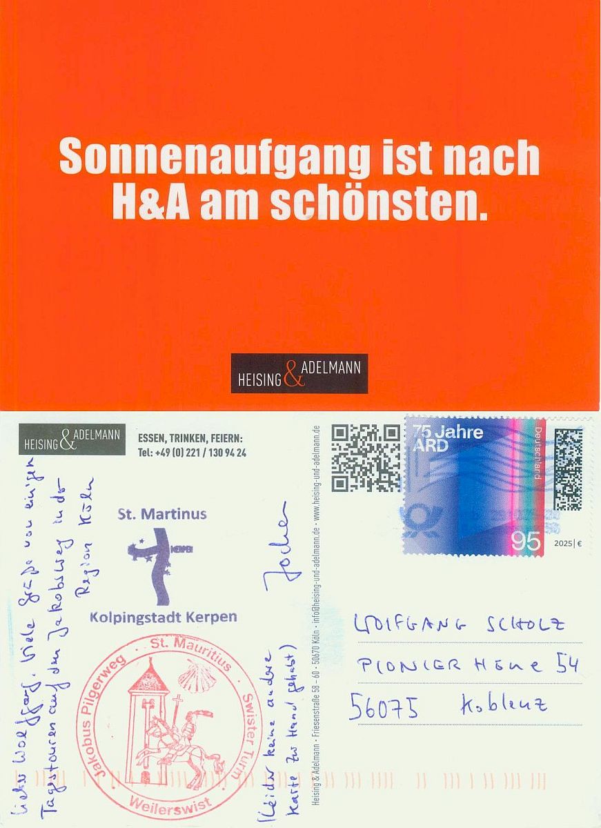 Manchmal bekomme ich liebe Post von Pilgern, die auf einem Jakosbweg unterwegs sind. Ich bin jedesmal sehr erfeut, wenn ich eine Postkarte im Briefkasten finde. Herzlichen Dank dafür.